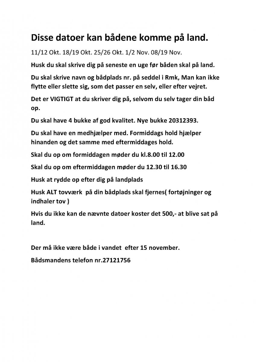 Paragraf 5, i klubbens love omhandler bl.a. at båden skal have korrekte fortøjninger, indhalertov, fender og at alle har klubflag på båden, samt at båden skal være vedligeholdt. Der er alt for mange der ikke holder øje med deres både. Få det nu ordnet så vi alle kan være vores klub bekendt. Hvis dette opslag ikke hjælper, vil de berørte bådejer blive kaldt ind i klubben i løbet af august. Hvis du skal have råd/hjælp til dette så kontakt bestyrelsen. Bestyrelsen.
