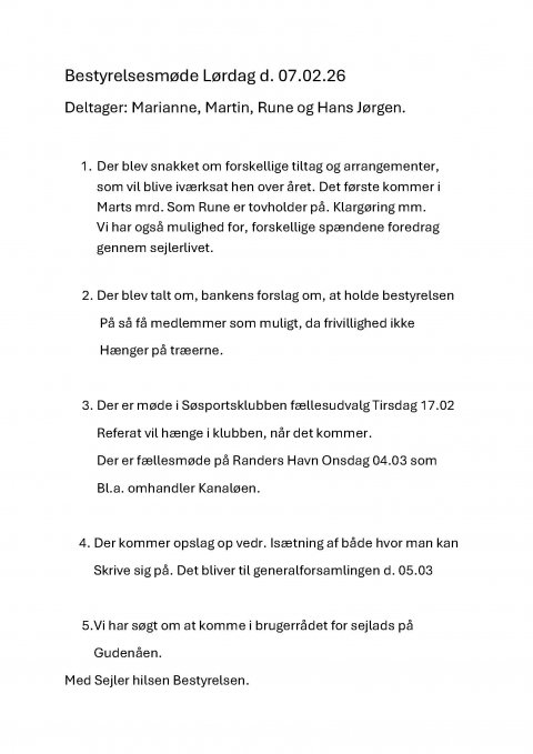 2. Langelinie festen har været oppe at vende, der kommer opslag på tavlen. 3. For dem der gerne vil bruge mere strøm end lige til håndværktøj og batteri opladning, er der nu mulighed for at sætte en bimåler op for egen regning, bimåleren skal være af en type som ikke kan nul stilles, og skal godkendes af formanden, eller et andet bestyrelses medlem, der skal aflæses og afregnes når bådene kommer på land, eller ved udmelding af kluppen, det vil ind til videre komme til at koste 3 kr. pr. kwh.